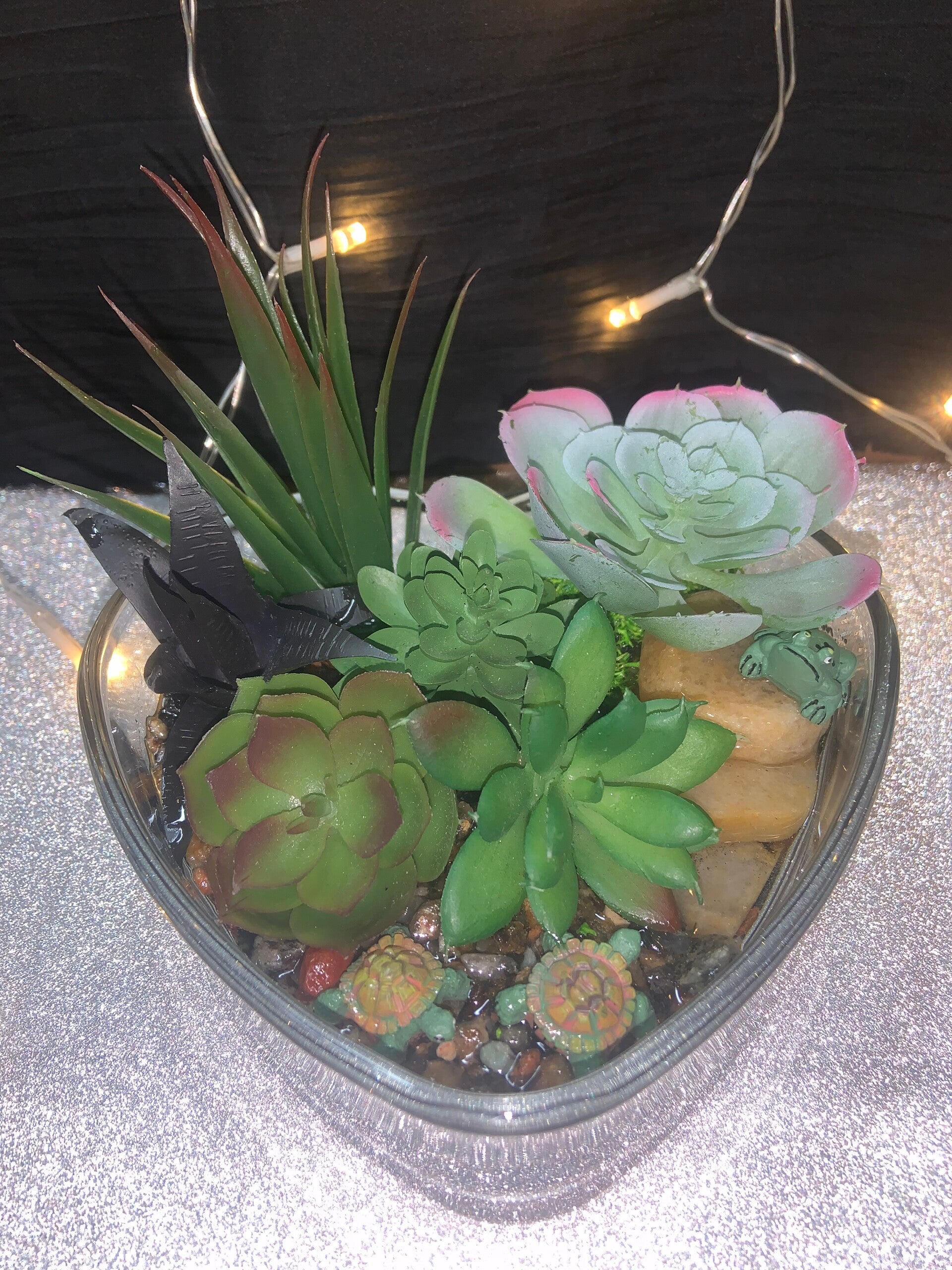 Introducing the heart-shaped terrarium, a unique and charming way to bring a touch of nature into your home. This terrarium is filled with a variety of cacti and succulents, creating a beautiful and little to no maintenance indoor garden. The heart shape adds a playful and romantic touch to any space, making it a perfect gift for loved ones or a lovely addition to your own home decor. The terrarium is easy to care for, as the succulents and cacti thrive in the contained environment, requiring no watering or sunlight. This makes it an ideal choice for those with a busy lifestyle or those who want to bring a touch of greenery to their living space without the hassle of a traditional potted plant.